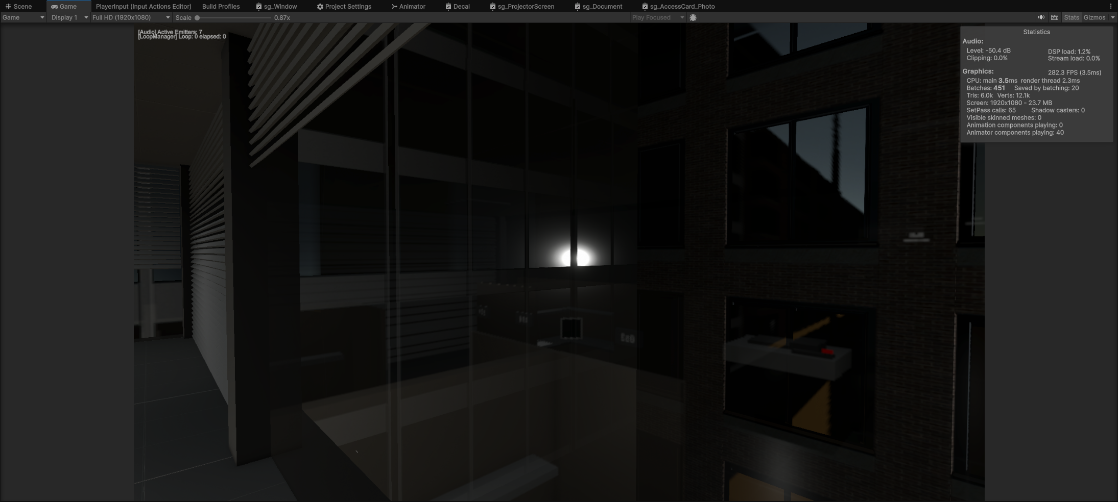 Performance was starting to dip at this point, which is where my decision to begin non-visible lights began. It came with a few caveats, like making sure lights inside the active room remained, whilst those in adjacent rooms turned off - so as not to hinder the lighting aesthetic of the room the player is in.