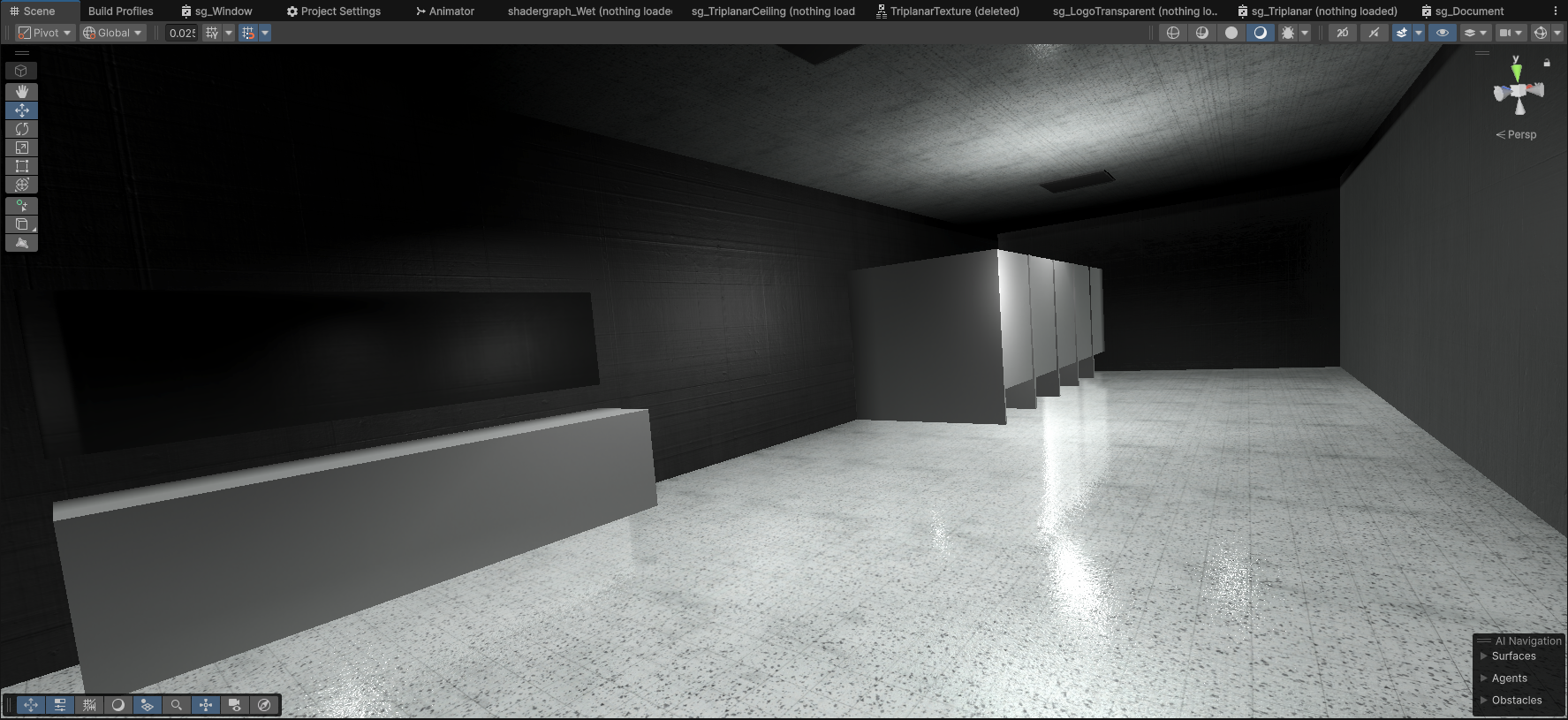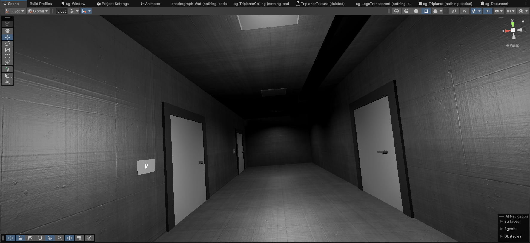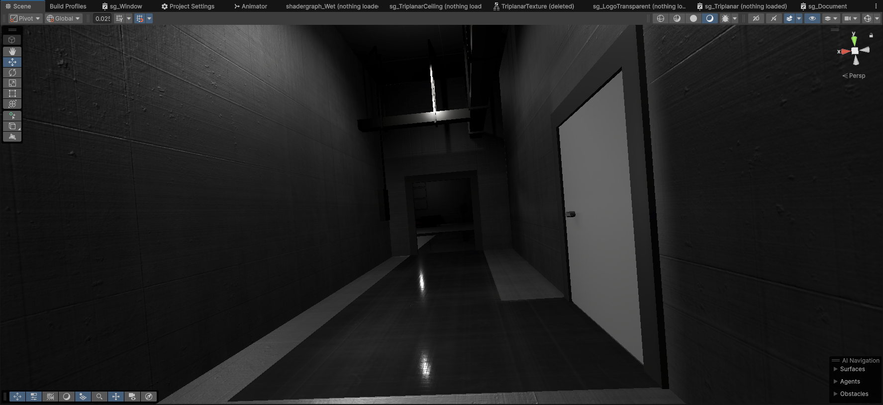 After burning through a lot of mental energy with the performance and early sprint work, I took some time to slow down and focus on world-building through materials. I discovered AmbientCG's CC0 texture library and used it to refine both the interior and exterior spaces with the brutalist, sterile theme of the project. The added surface detail immediately gave the world more weight and believability.