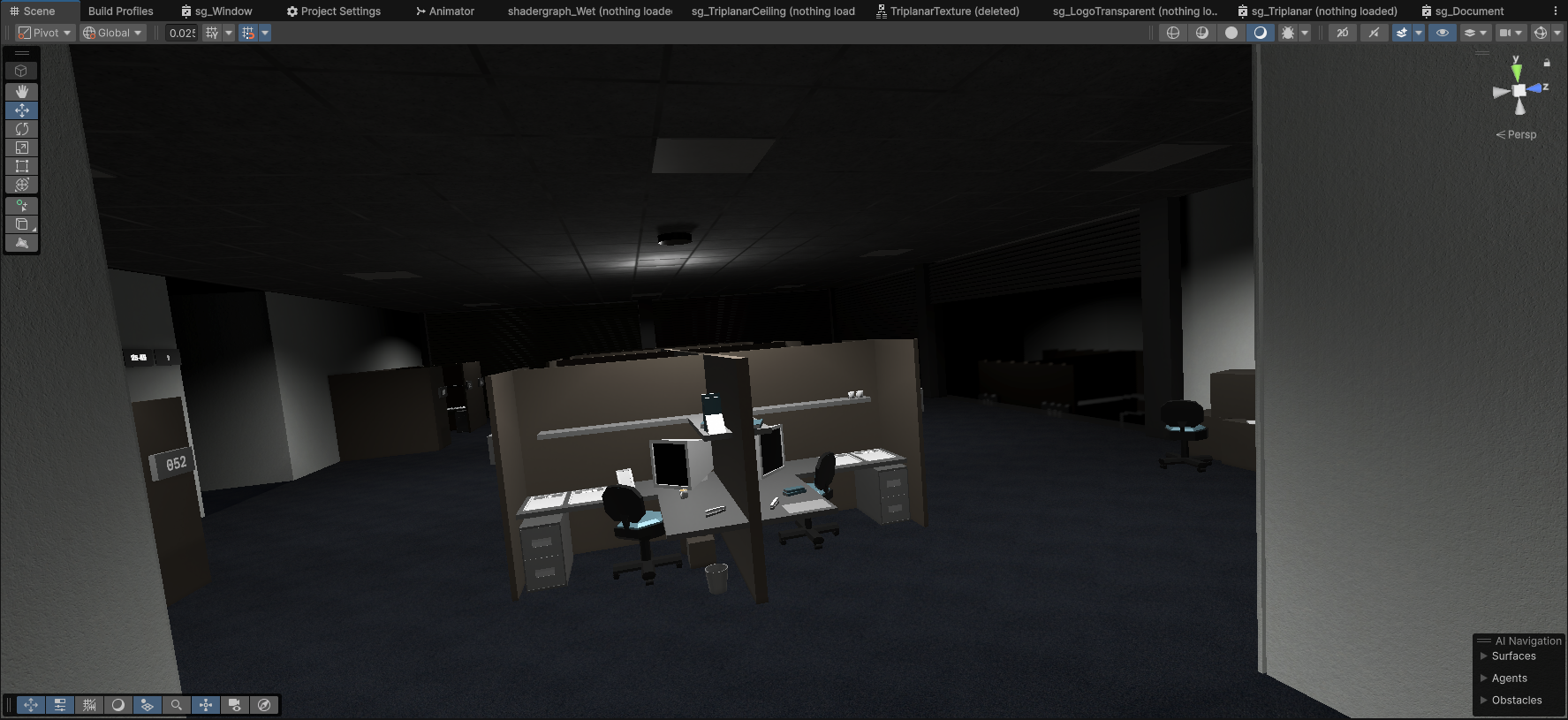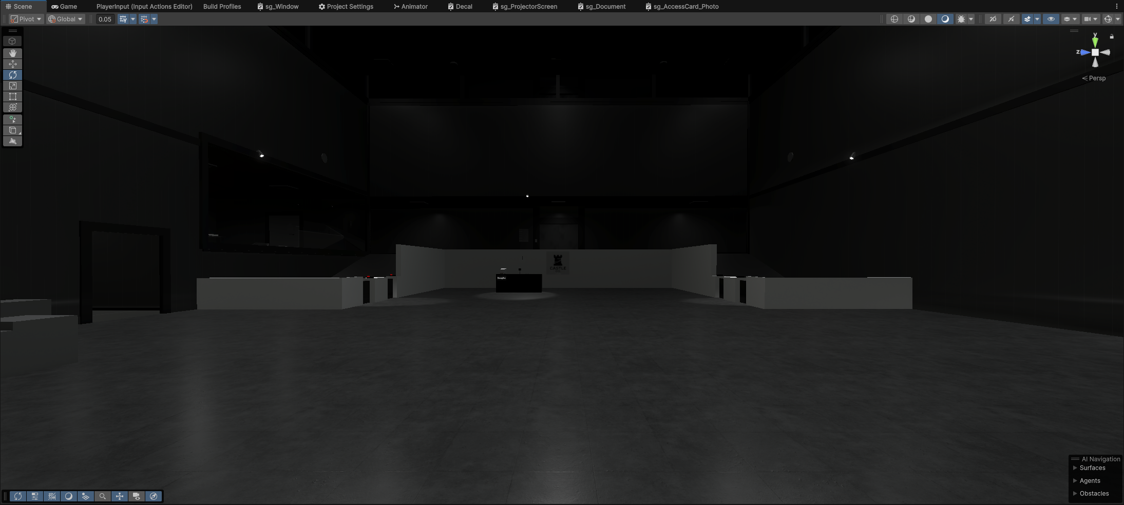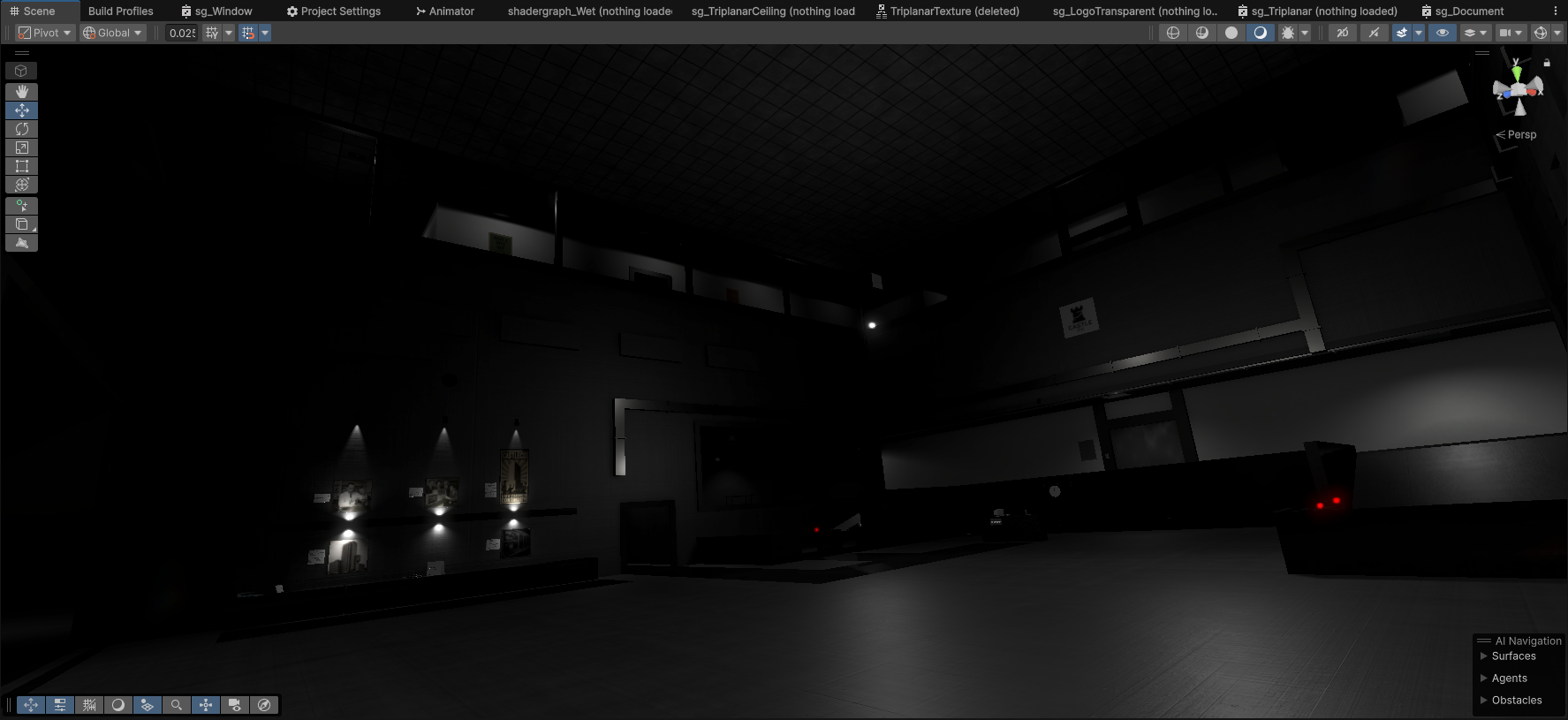 After burning through a lot of mental energy with the performance and early sprint work, I took some time to slow down and focus on world-building through materials. I discovered AmbientCG's CC0 texture library and used it to refine both the interior and exterior spaces with the brutalist, sterile theme of the project. The added surface detail immediately gave the world more weight and believability.
