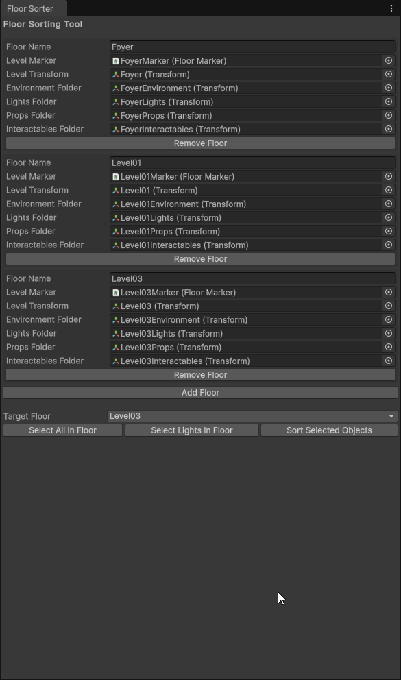 Performance was starting to dip as the level grew, especially with multiple floors bleeding light into one another. I wrote an internal floor-sorting tool that automatically organises objects (lights, props, interactables) into their corresponding floor folders.
