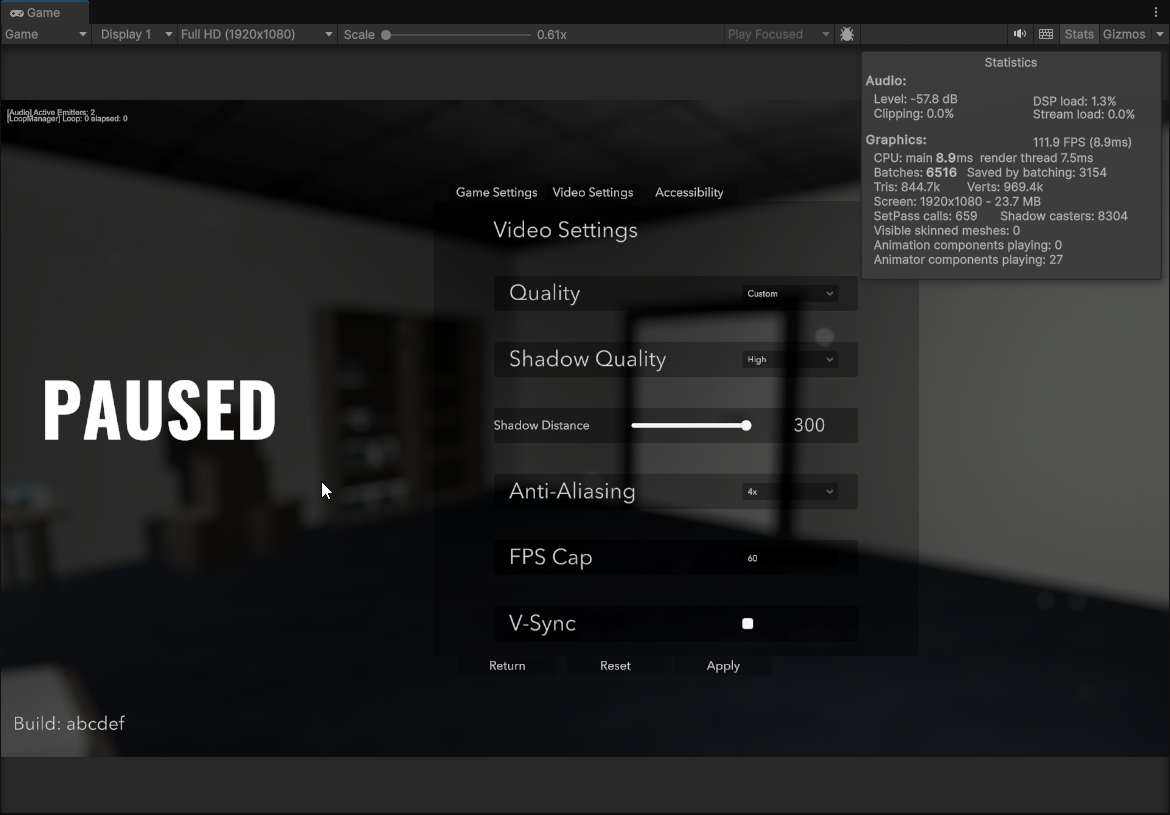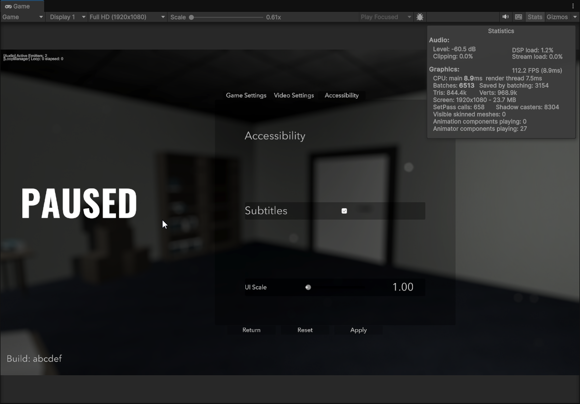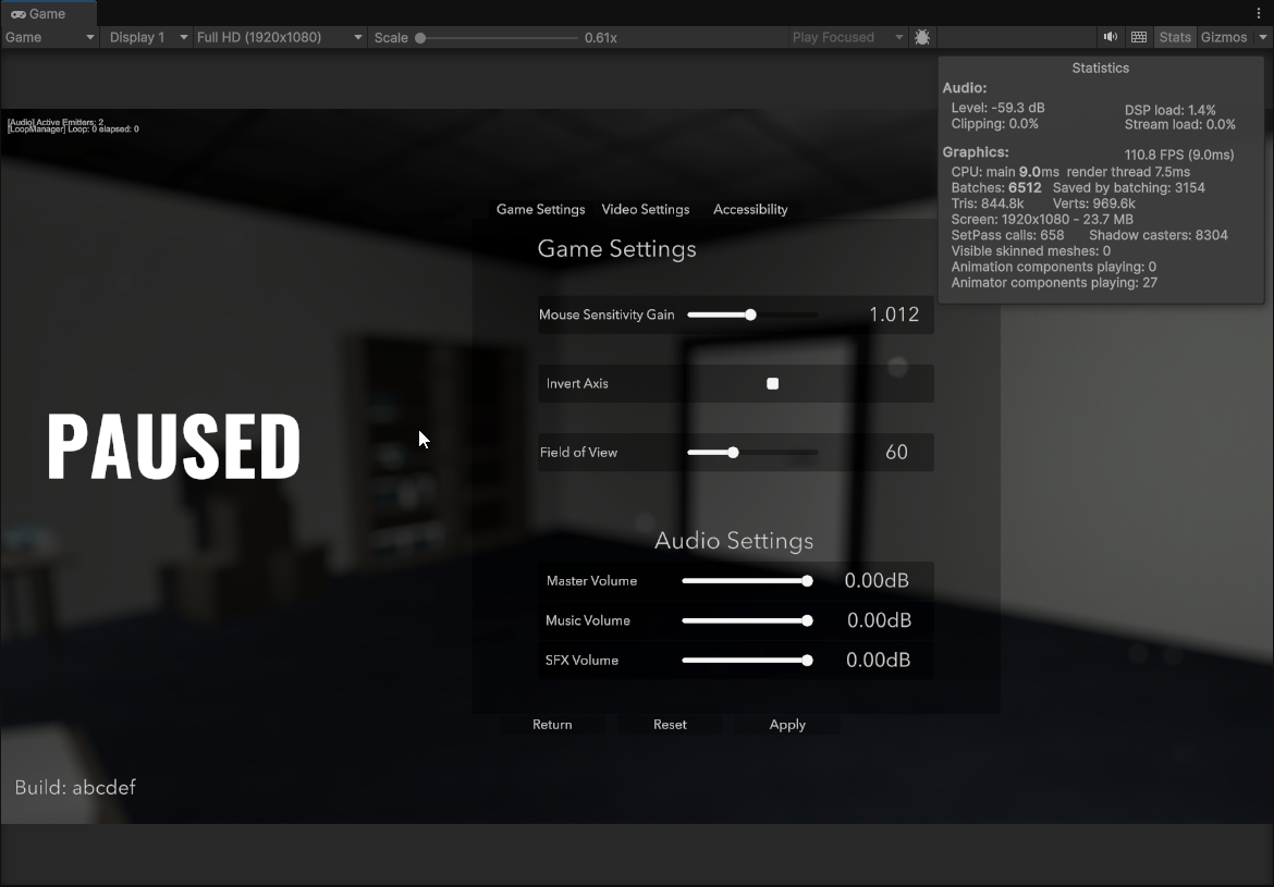 Implemented the first pass of the settings menu. Player's can now adjust mouse sensitivity, master/music/SFX volume, and toggle subtitles. Video settings are stubbed in and will expand next sprint to include quality presets and more accessibility options.